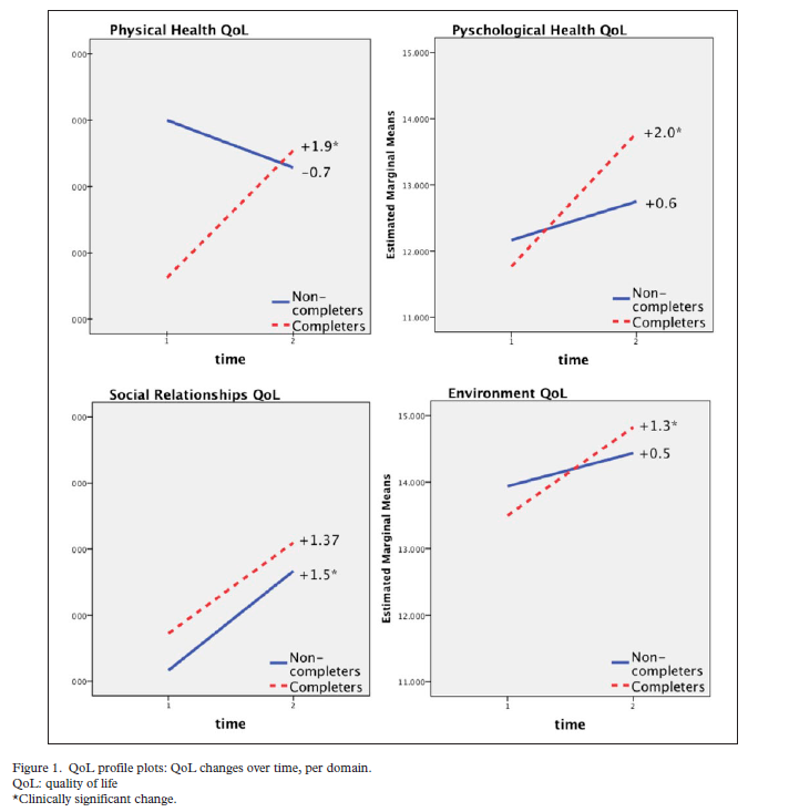 There was a clinically significant increase in completers’ physical health quality of life (QoL) and psychological health QoL. The decrease in the physical health domain for non-completers was not clinically significant. The improvements for both groups seen in the social relationships and environment domains were not significant.